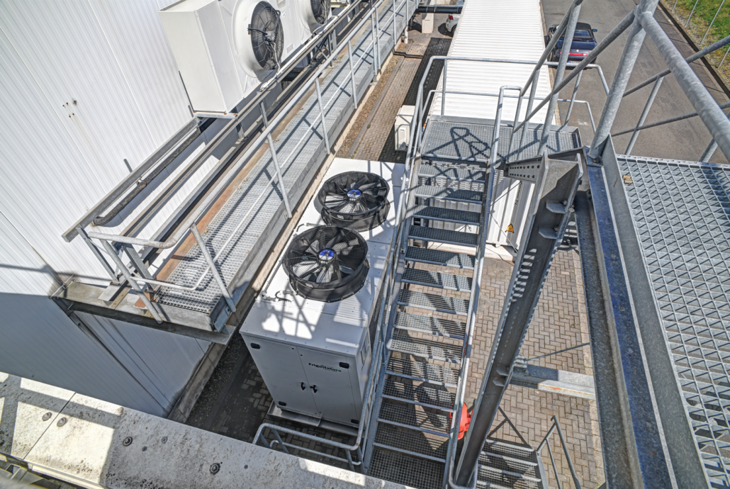 Der verfügbare Platz für die neue Kälteanlage war äußert begrenzt, da der Rückbau der bisherigen Anlage schrittweise geplant ist. Daher waren kompakte Dimensionen erforderlich. Der neue Propan-Flüssigkeitskühlsatz befindet sich in Außenaufstellung vor dem Gebäude. Die Anlage ist auf der Kaltsoleseite mit zwei Pufferspeichern mit einem Fassungsvermögen von jeweils 2.500 Liter verbunden. Die Pufferspeicher befinden sich in einem separaten Maschinenraum, der als Containerlösung direkt neben dem Flüssigkeitskühlsatz realisiert wurde. Als Medium dient Ethylenglykol, das mithilfe von drehzahlgeregelten Pumpen zu den Verdampfern in den beiden Kühlräumen des Fruchthofs gefördert wird. Die Anschlüsse für weitere Pumpen im Rahmen zukünftiger Modernisierungsarbeiten sind ebenfalls bereits vorbereitet. Bei diesem Projekt kommen zudem luftgekühlte Verflüssiger zum Einsatz.